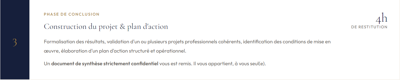 ✔️ Absolument pas. Le bilan vous appartient. Certains bénéficiaires repartent avec une reconversion claire, d’autres avec une évolution dans leur domaine actuel, d’autres encore avec la confirmation que leur situation est bonne – simplement vue différemment.