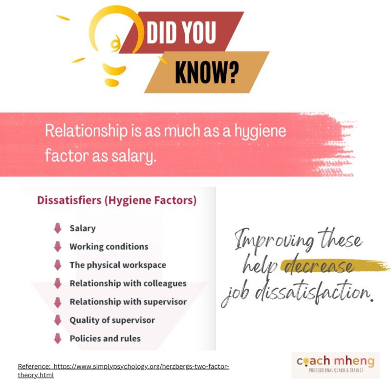 Hygiene factors are the minimum requirements that need to be met to avoid “unpleasantness” in a job. When not met, they become “dissatisfiers” that cause employees to complain. The point that I want to drive here is that there are several hygiene factors. What comes to mind so easily is salary. But along with salary are working environments and relationships with colleagues and supervisor.