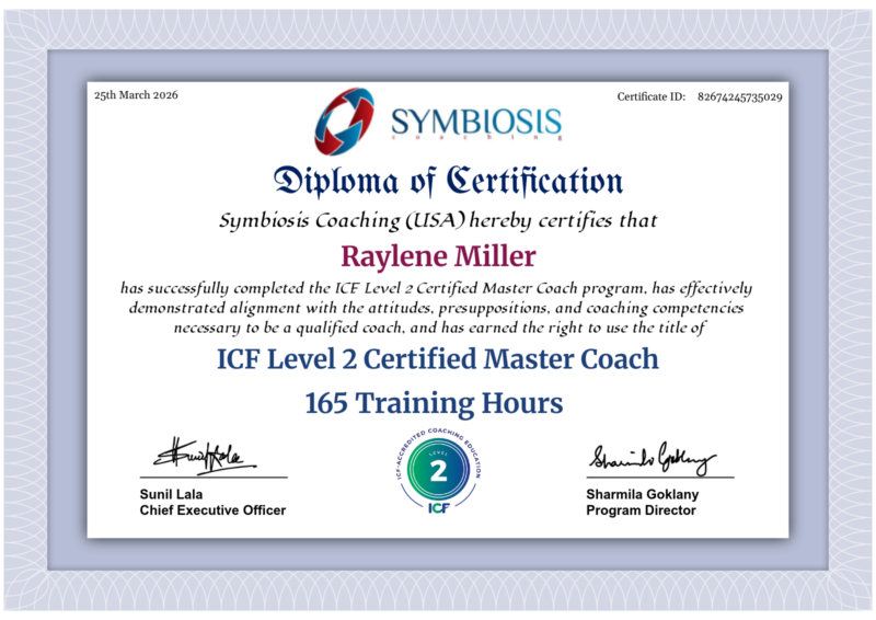 Raylene Miller holds an ICF Level 2 Certified Master Coach certification, representing 165 hours of advanced, ICF-accredited training and a high standard of mastery in professional coaching. This credential reflects her expertise in executive-level coaching, strategic thinking, and leadership development. Through this rigorous training, Raylene partners with executives, business owners, and senior leaders to sharpen decision-making, expand strategic vision, and lead with clarity in complex, high-stakes environments. Her coaching approach is grounded in elevating performance, strengthening leadership presence, and driving measurable outcomes. As part of the pathway toward the prestigious Master Certified Coach (MCC) designation, this achievement underscores her commitment to coaching at the highest level of impact and excellence.