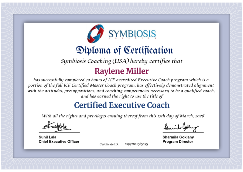 Raylene has successfully earned her Certified Executive Coach certification through an ICF-accredited program, completing over 70 hours of advanced executive coaching training.